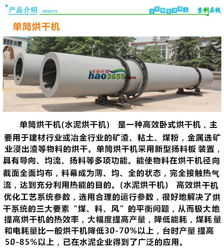 單筒烘干機(jī)φ3×25,也叫滾筒干燥機(jī),它廣泛用于建材、冶金、化工、水泥工業(yè)烘干礦渣石灰石、煤粉、礦渣、粘土等物料。該機(jī)主要由回轉(zhuǎn)體、揚(yáng)料板,傳動裝置,支撐裝置及密封圈等部件組成。具有結(jié)構(gòu)合理,制作精良,產(chǎn)量高,能耗低,運(yùn)轉(zhuǎn)方便等優(yōu)點(diǎn)。