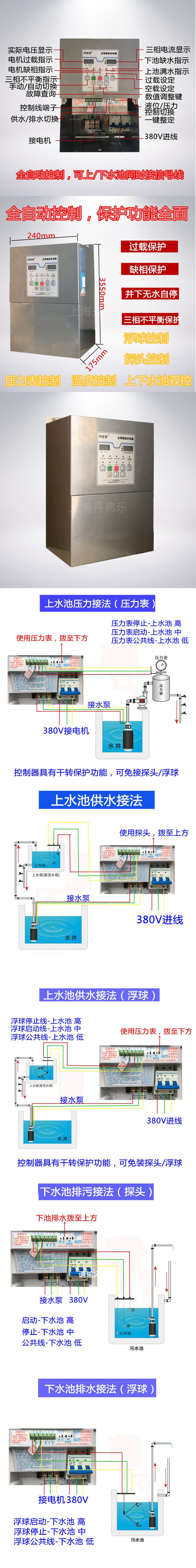 3.多重控制方式:浮球控制,探頭控制,壓力表控制,溫度控制,上下水池雙控產(chǎn)品尺寸:240mm*175mm*355mm